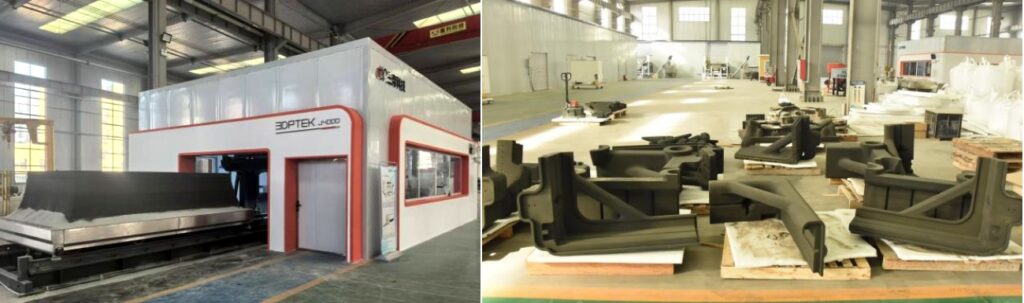 El equipo puede resolver eficazmente los problemas de eficiencia y coste de la fundición en arena de gran tama?o, proporcionando una nueva solución para la industria. 3DPTEK-J4000 adopta la tecnología de moldeo de área flexible de caja sin arena, que admite la impresión local, y puede moldear un máximo de 4 metros de fundición en arena, y puede completar la fundición de una sola pieza de piezas estructurales complejas y de gran tama?o, lo que mejora en gran medida la eficiencia de la producción y la calidad de la fundición para satisfacer los requisitos de aplicación de la fundición en arena de gran tama?o y alta precisión. Puede mejorar en gran medida la eficiencia de la producción y la calidad de la fundición, y satisfacer los requisitos de aplicación de piezas de fundición en arena de gran tama?o y alta precisión.
