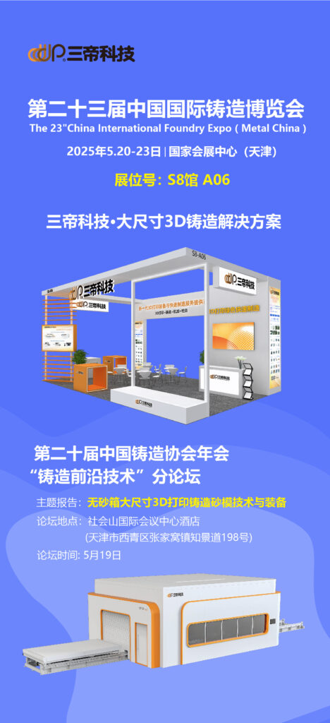 第23屆中國國際鑄造博覽會即將于2025年5月20日在天津國家會展中心(天津市津南區咸水沽鎮國展大道888號)舉辦,北京三帝科技股份有限公司(以下簡稱“三帝科技”)將攜大尺寸3D鑄造解決方案參展。